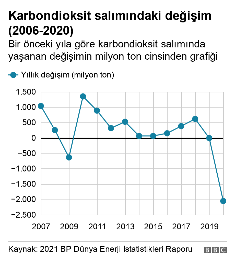 "Covid yılı" olarak nitelenen 2020'de küresel enerji talebi yüzde 4,5 düzeyinde, enerji kaynaklı küresel karbon salımı ise yüzde 6,3 düzeyinde düştü. Önceki tahminlerde enerji talebinin yaklaşık yüzde 2,5 düşeceği öngörülmüştü.