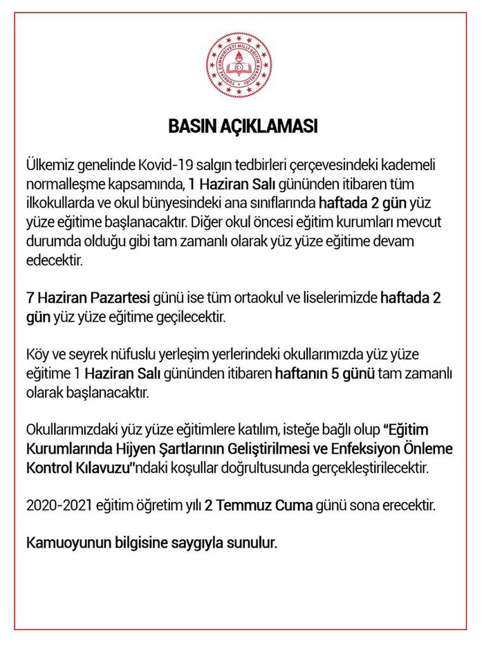 Bakan Selçuk açıklamasında, "Kavuşuyoruz! Yarın itibariyle ilkokul öğrencilerimiz, 7 Haziran Pazartesi’den itibaren ise ortaokul ve lise öğrencilerimiz için haftada iki gün yüz yüze eğitime başlıyoruz" ifadelerini kullandı. Bakan Selçuk paylaşımında yeni takvimi şöyle açıkladı: