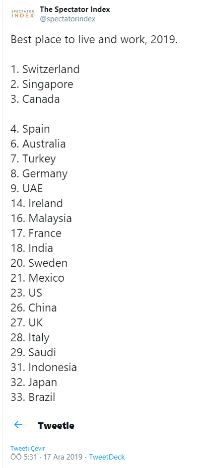 Yabancı çalışanlara en yüksek yaşam kalitesini sunan ülkeleri sıralaması şöyle: