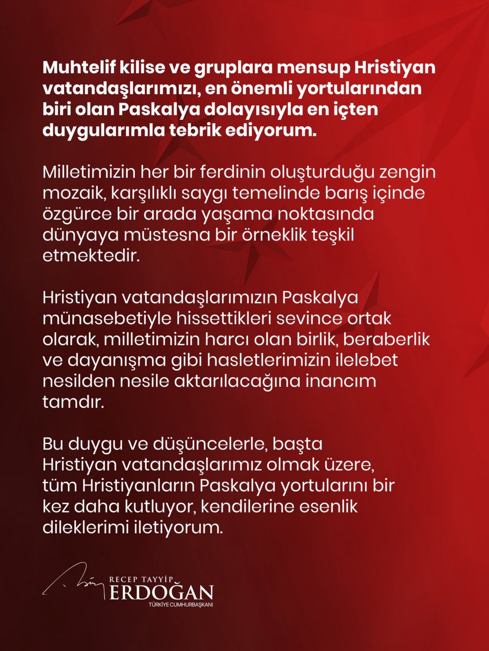 Cumhurbaşkanı Erdoğan, "Muhtelif kilise ve gruplara mensup Hristiyan vatandaşlarımızı, en önemli yortularından biri olan Paskalya dolayısıyla en içten duygularımla tebrik ediyorum." ifadesini kullandı.