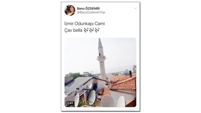 Bu olaydan nemalanarak olayı fırsata çeviren bazı kesimler bu konu üzerinden sosyal medyada paylaşımlar yaptı. CHP Eski İzmir İl Başkan Yardımcısı Banu Özdemir de camilerden ‘Çav Bella’ şarkısının çalındığı anları hesabında paylaşarak tepki topladı.