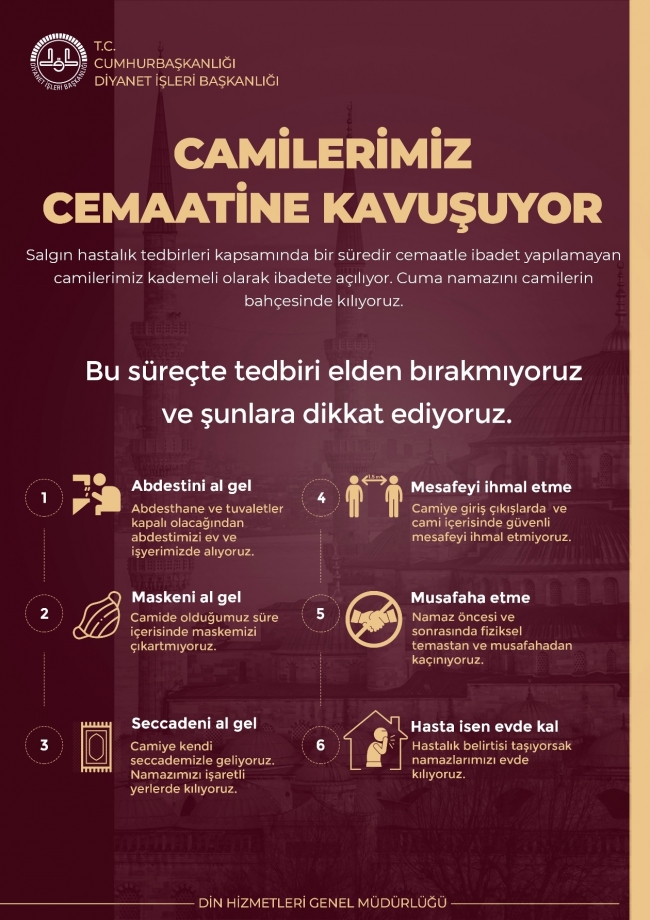 Cemaat uzun bir aradan sonra ilk defa 29 Mayıs’ta Cuma namazını camilerde birlikte kılacak. Diyanet İşleri Başkanlığı bu durum için bir afiş oluşturarak uyarıları yayınladı. Bu afişte cemaate, cami avlularında maskelerini çıkarmamaları ve camiye herkesin kendi seccadesi ile gelmesi istendi.