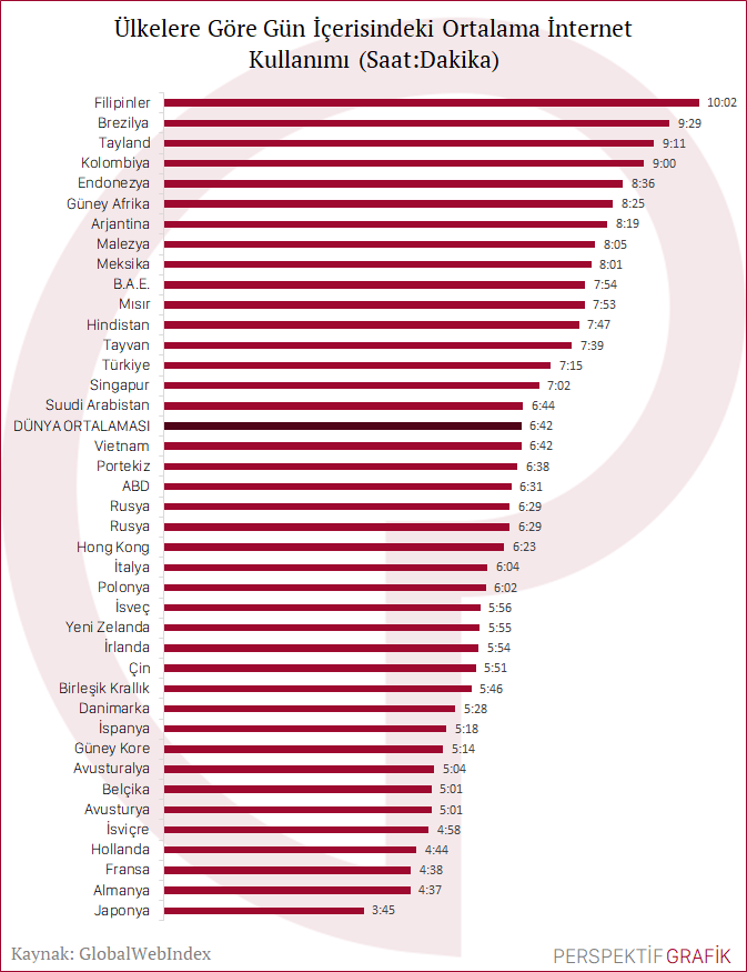 2019 itibariyle dünyada insanlar internette günde ortalama 6 saat 42 dakika geçirirken, bu süre, Türkiye’de 7 saat 15 dakikadır. Aşağıdaki tabloda görüldüğü gibi, internet kullanımı gelişmekte olan ülkelerden gelişmiş ülkelere giderek azalmaktadır. Yine, birçok araştırmaya göre, internette geçirilen sürenin %80’i sosyal medyada harcanmaktadır.