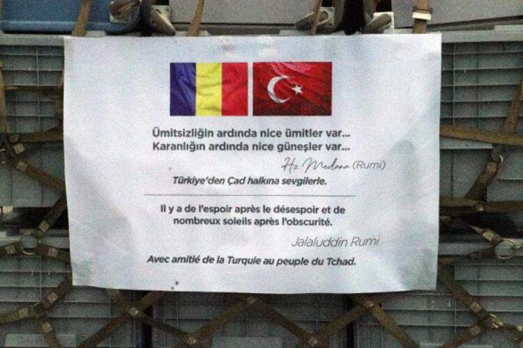 Uçaktaki yardım malzemesinin üzerinde Mevlana'nın, "Ümitsizliğin ardında nice ümitler var. Karanlığın ardında nice güneşler var." sözü Türkçe ve İngilizce olarak yer aldı.