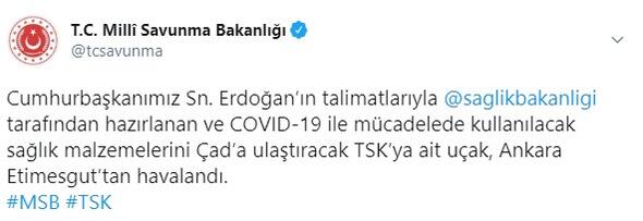 İhtiyaç duyan ülkelere tıbbi malzeme ve koruyucu teçhizat yardımlarıyla dünya tarafından minnetle karşılanan Türkiye, bu kez rotasını Çad'a çevirdi. Türkiye'nin yeni tip corona virüsle (Covid-19) mücadele kapsamında Afrika ülkesi Çad'a yardım malzemelerini taşıyan uçak, Ankara'dan hareket etti.