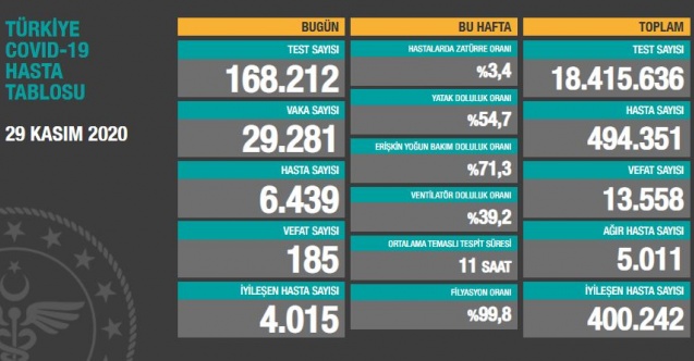29 Kasım 2020 Koronavirüs verilerine göre Türkiye'de son 24 saatte 29 bin 281 vaka tespit edildi.