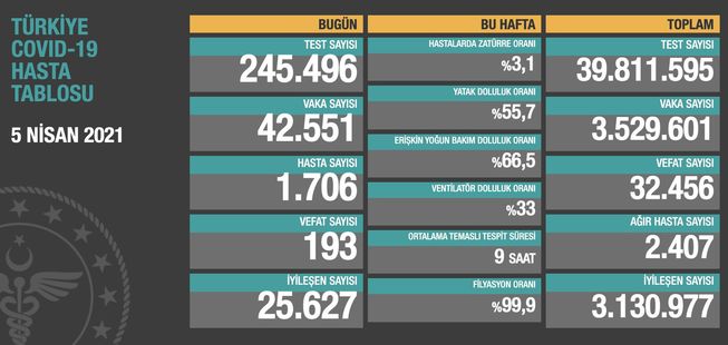 Son dakika... Sağlık Bakanlığı yeni koronavirüs tablosunu açıkladı. Bugün 42 bin 551 yeni vaka tespit edildi, 193 hasta ise hayatını kaybetti.