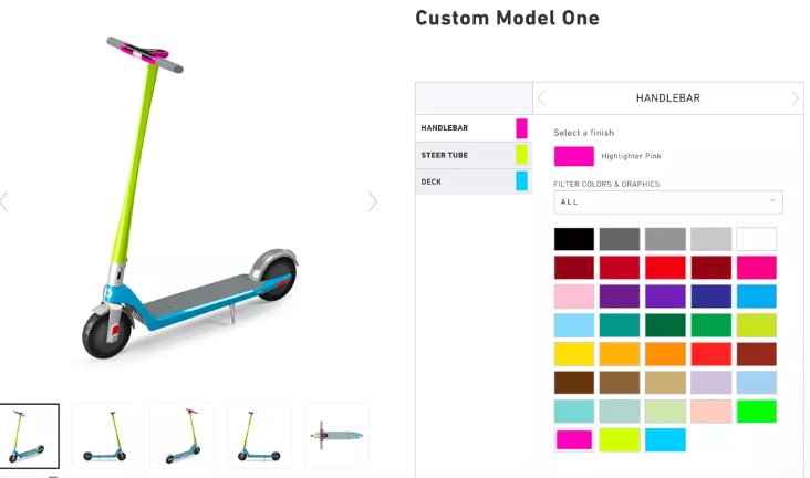 Nike’ın ayakkabılarında kullanıdığı bu kişiselleştirilmiş ürün deneyimini elektrikli scooter için uyarlayan marka, renk düzenini seçme, karbon fiber bir çerçeve ya da farklı bir gidon ile özelleştirmeyi sağlıyor. Benzersiz ve bir başkasında olmayan ürünleri seviyorsanız bu model sizin için güzel bir alternatif sağlayabilir.
